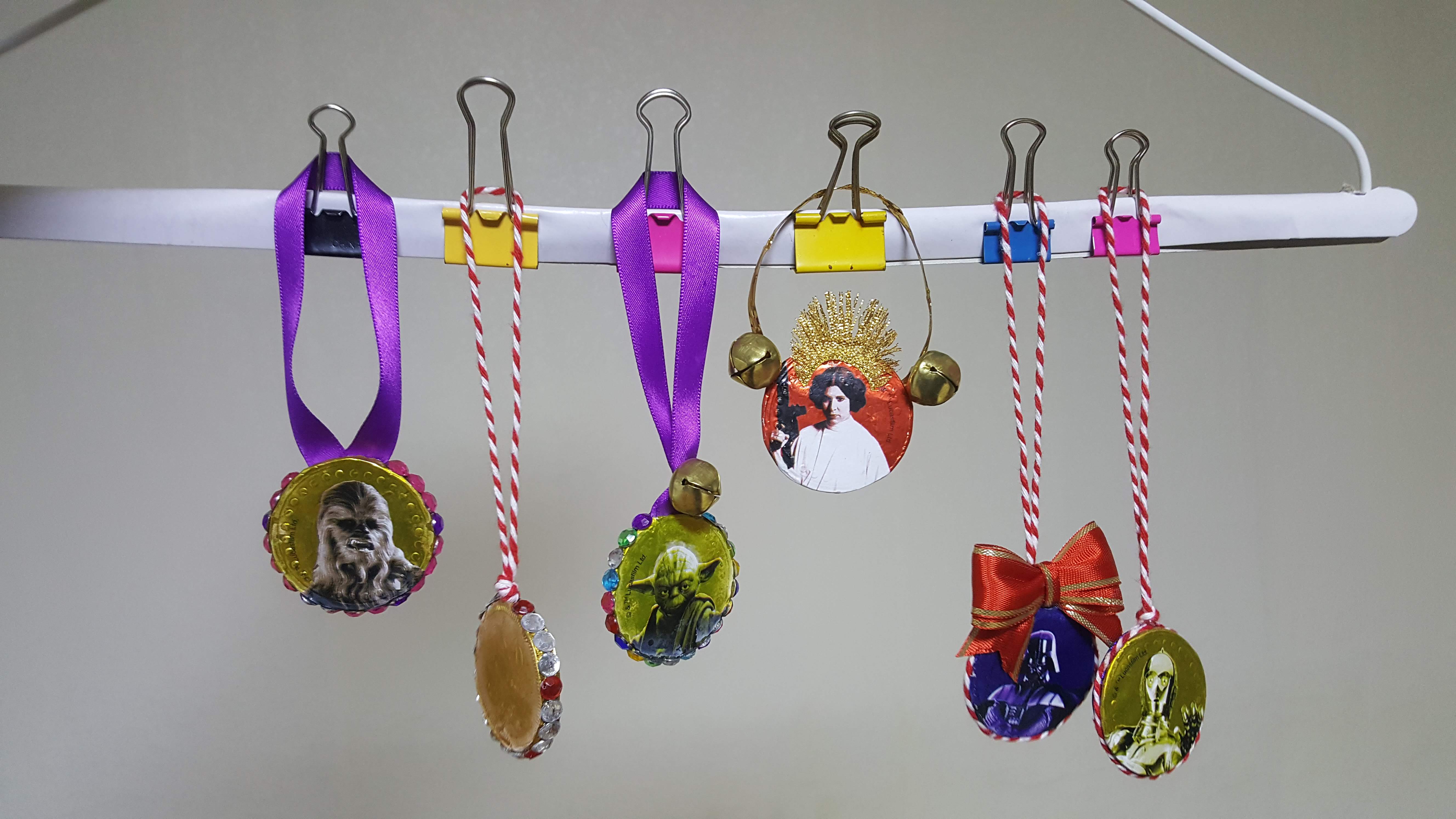P.S. My favorite is the Leia ornament. I had a bit gold ribbon that had unraveled into that neat little medieval painting halo/crown-like fringe. Then another eureka moment to attach TWO bells on either side of the medallion, a la her iconic hairdo. I’m glad I kept the twist-tie for the hook/loop.
