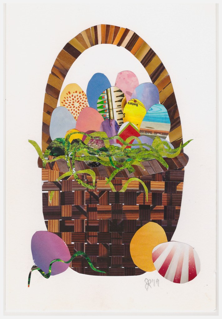 I woke up early this Easter morning with the idea to collage an Easter egg basket. But then I remembered Peeps and suddenly had the urge to cut out those cute little marshmallow chicks. Luckily, I had some painted papers that would match for some brightly colored peeps, so cut I did.