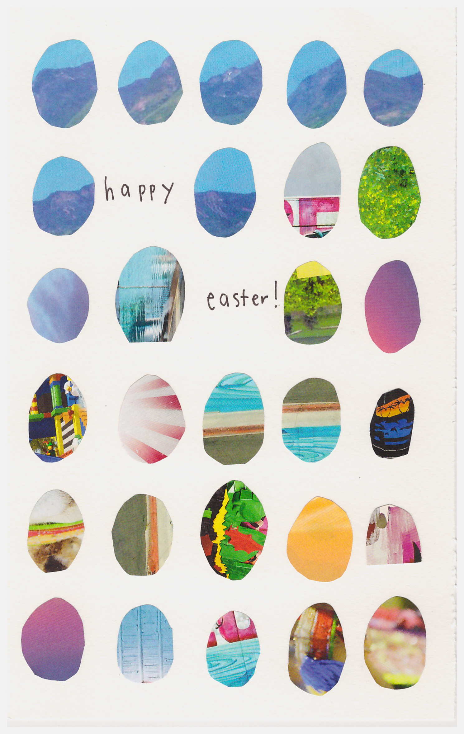 After warming up with some peep cutouts, I moved on to the basket, which was completed fairly quickly since I had a clear idea of what I wanted to make from the start. As I was cleaning up, all the little eggs that didn’t make the cut were just too cute to go to waste, so I just glued them in all their lumpy glory onto a card. Which then also inspired the black, scenic Easter egg mashup card. Something about the sky, with its majestic heavens-like clouds, said “Easter” to me.