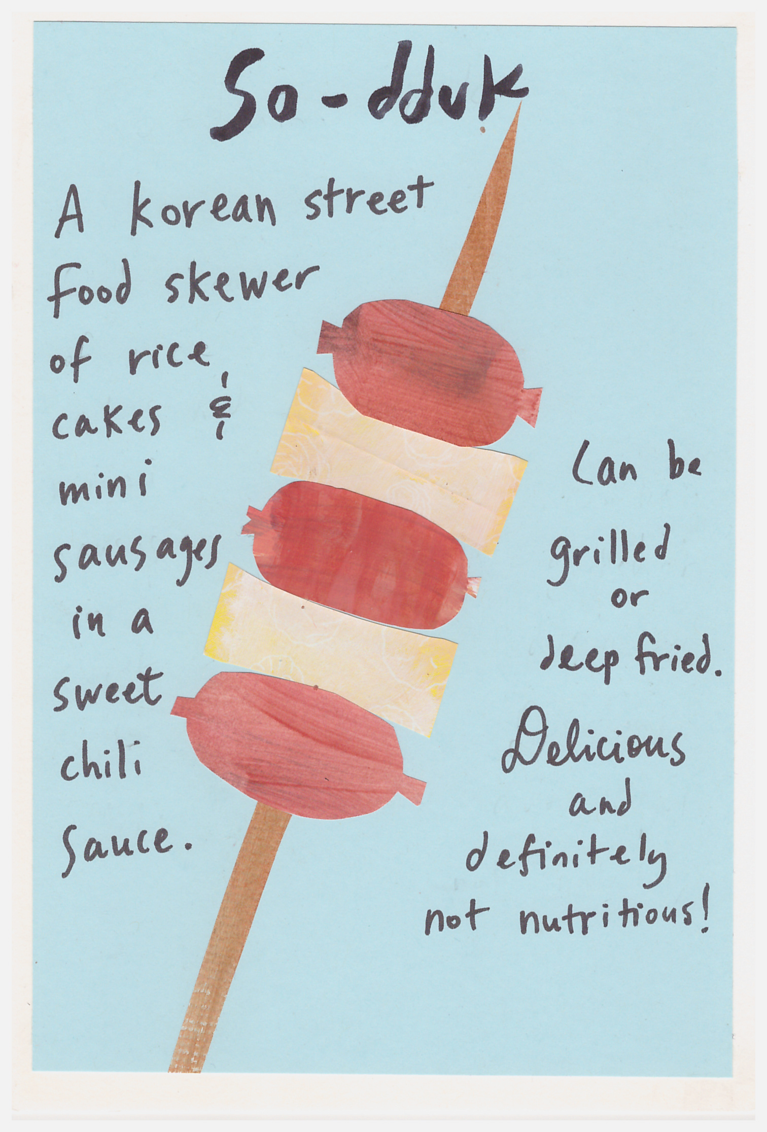 So I wanted to make series of postcards introducing Korean foods, starting with a street food that I was late to the game to discover: so-dduk, short for sausage and rice cake. The postcard is fairly self explanatory.