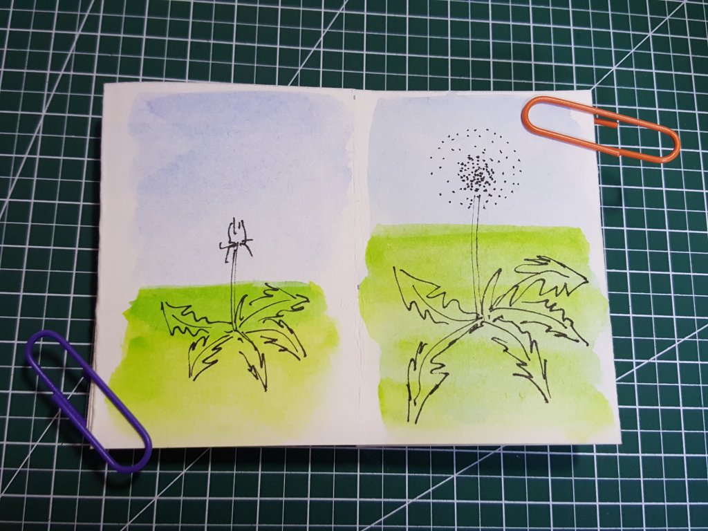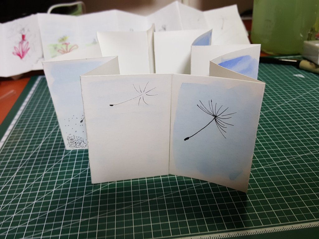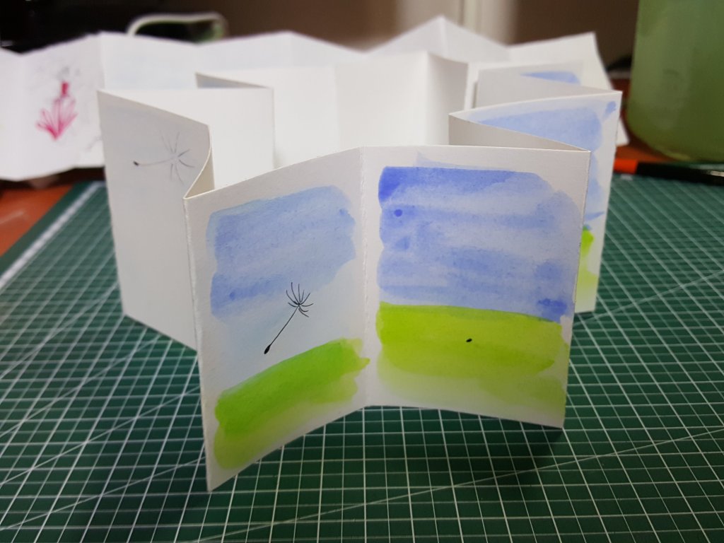 I’ve also been wanting to try my hand at zines, so tonight I made a never ending book about a dandelion. I meant to color in the dandelion as well, but I liked the simplicity of the black pen on watercolor wash. I might still color it in later. What do you think–color or no?
