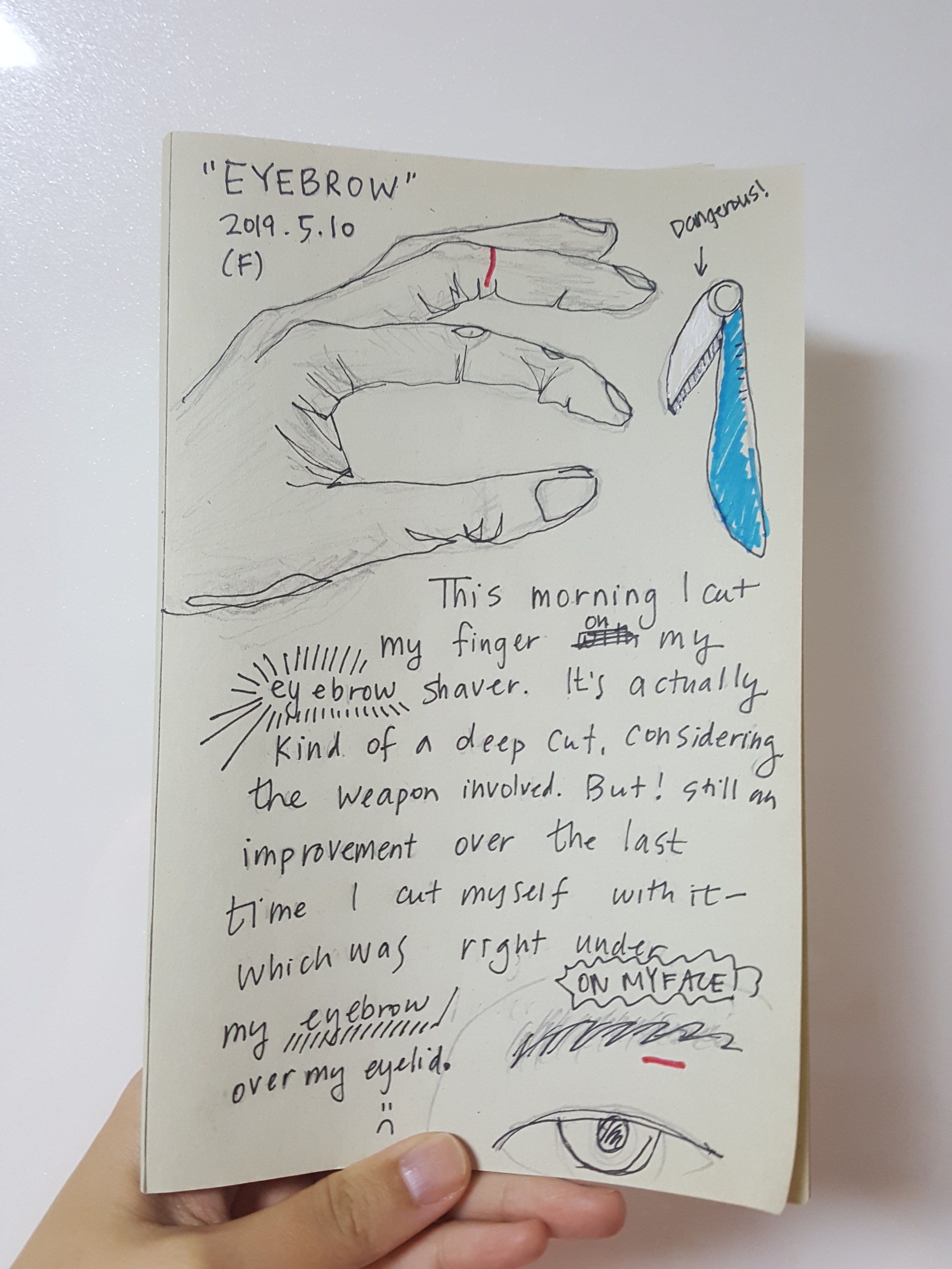 I started shaving (versus plucking) my eyebrows when I came to Korea. Usually it is much easier than plucking, but I got a new eyebrow shaver recently and it’s obviously still razor sharp.