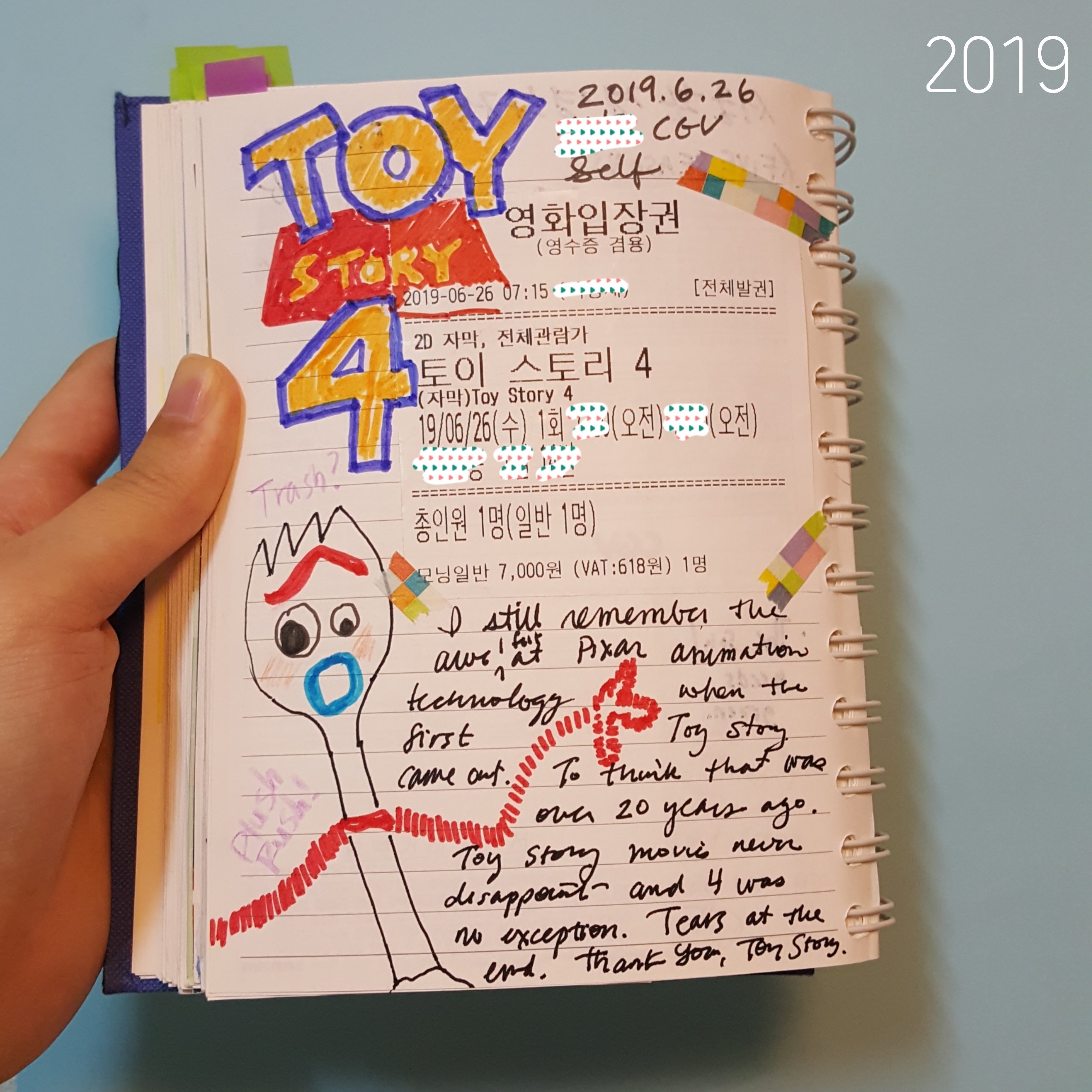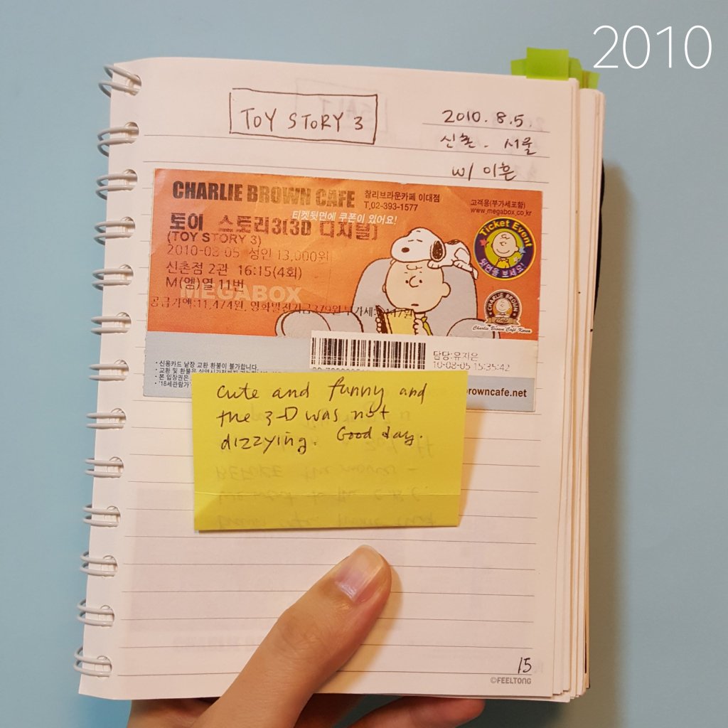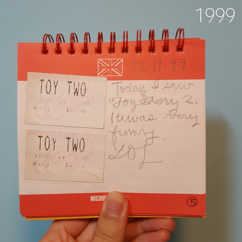 Since I was young lamb (hehe) I’ve kept a little scrapbook of the ticket stubs with mini reviews of the movies I saw in theaters. When the latest installment of a series like this comes out, it’s fun to revisit what I wrote for the previous movies. Looking back my Toy Story entries are pretty basic, which might be a good thing as I was a bit of a precocious kid in the year 99 and a more detailed review like I wrote for other movies at the time would be too embarrassing to share. Was surprised to see from my Toy Story 2 entry that the term “lol” was around 20 years ago.