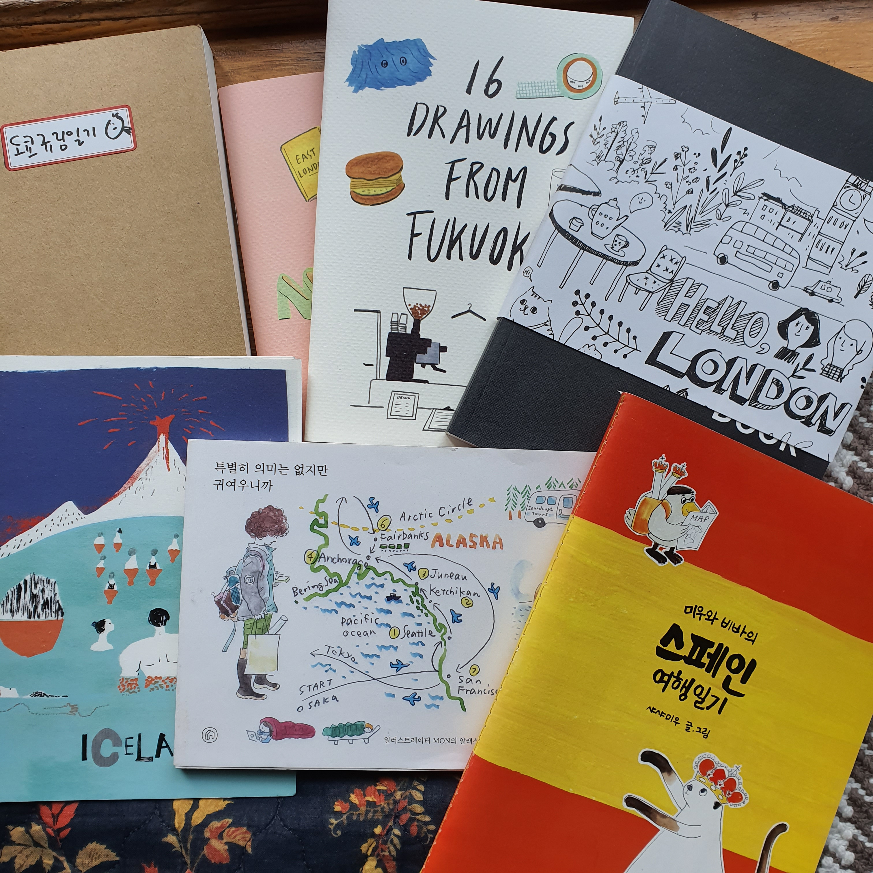 This year I inadvertently started collecting self-published illustrated travel journals, a happy habit born of my introduction to the world of indie bookstores and self-publishing in Korea. Self-published journals have this distinctly homemade feel that is really endearing. You won’t find Nat Geo-level photos or detailed information on where to eat and sleep, but you get a glimpse into the author’s personal travel experience, their creative style and personality. These are just some of my books that I have on hand right now. I could probably do a Part II with the rest of my collection.