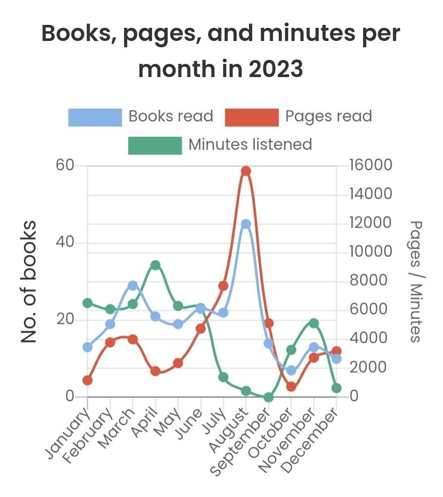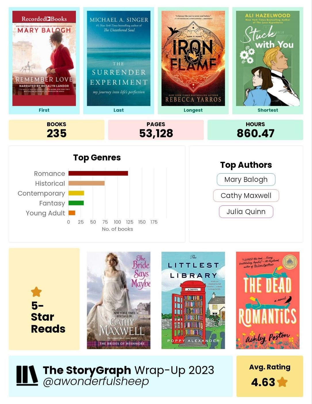 A new year means a look back on the books I read the previous year. 2023 marked a crazy year of reading for me, as you can see in my Storygraph summary below.