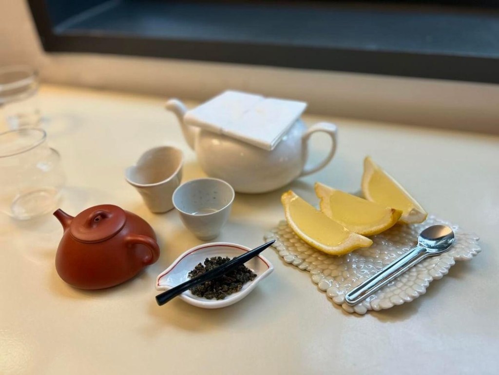 It was the dry tea leaves! We scooped some into the tea pot to steep before pouring. It was a very fancy and dainty experience. The tea had a very creamy taste that was very surprising!