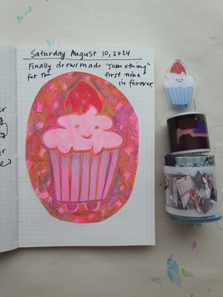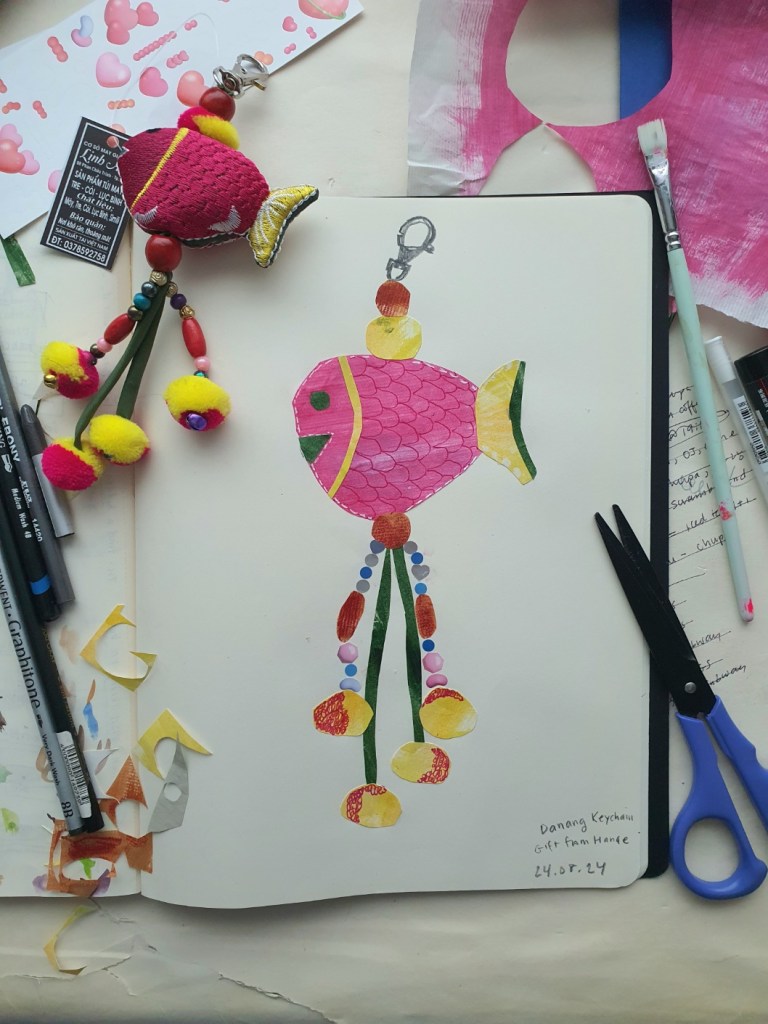 The creative funk continued through August, but I did manage to make two things, both of which, incidentally, were hot pink. (Not incidentally, hot pink is one of my favorite colors.) I’ve had this piece of paper painted with hot pink ink for forever, so finally I sat down and decided to do something with it. I picked up my magic pencil and drew what was literally right in front of me, my washi tape holder from Recorder Factory. After Uri’s visit, I also felt inspired to collage the pink fish keychain she gifted me from her trip to Da Nang, Vietnam. It was nice to create again, even as sweat gathered on my brow and dripped down my arms as I snipped and pasted.