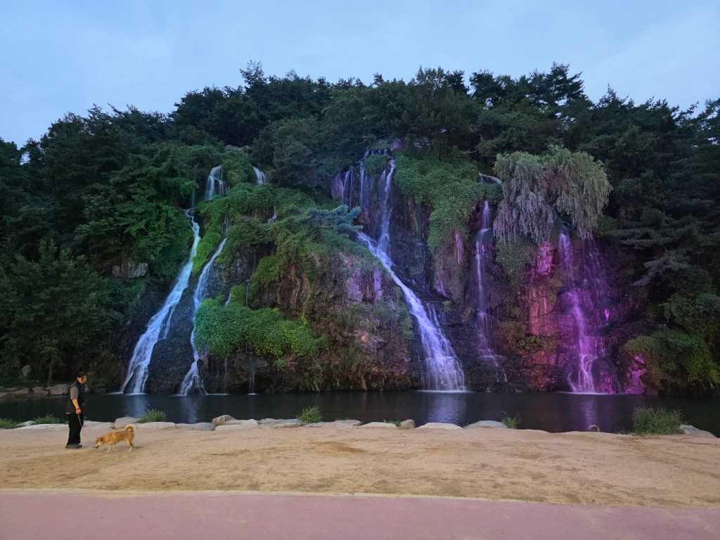 I’ve only been to this waterfall during the day, so this evening visit revealed they have colored lights at night. I’ll have to go back when it’s properly dark.