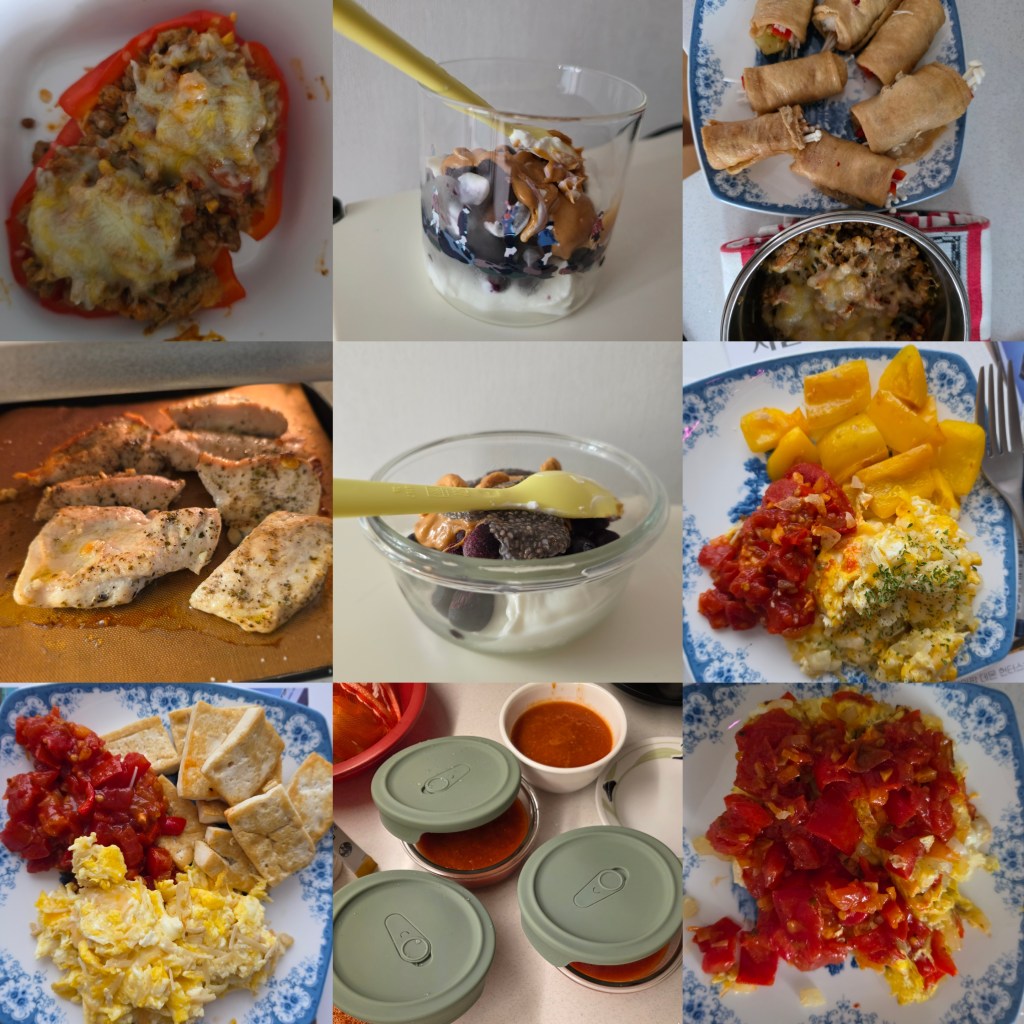 Why yes, that is a beef-stuffed bell pepper you see in the top left corner. It was pretty good, but again, not sure if it was worth the extra effort to blanch the pepper first before stuffing with ground beef and veg mixture and baking with cheese. Can you tell I bought a box of tomatoes around this time? I added this tomato-onion fry-up as a colorful pairing with cheesy eggs, and then used the rest to meal prep lots of tomato soup, which was delicious and froze well too.