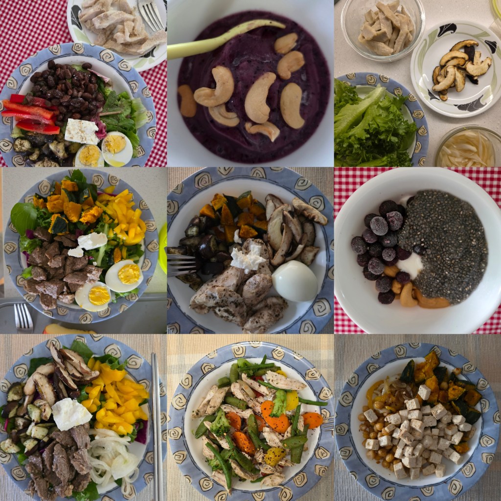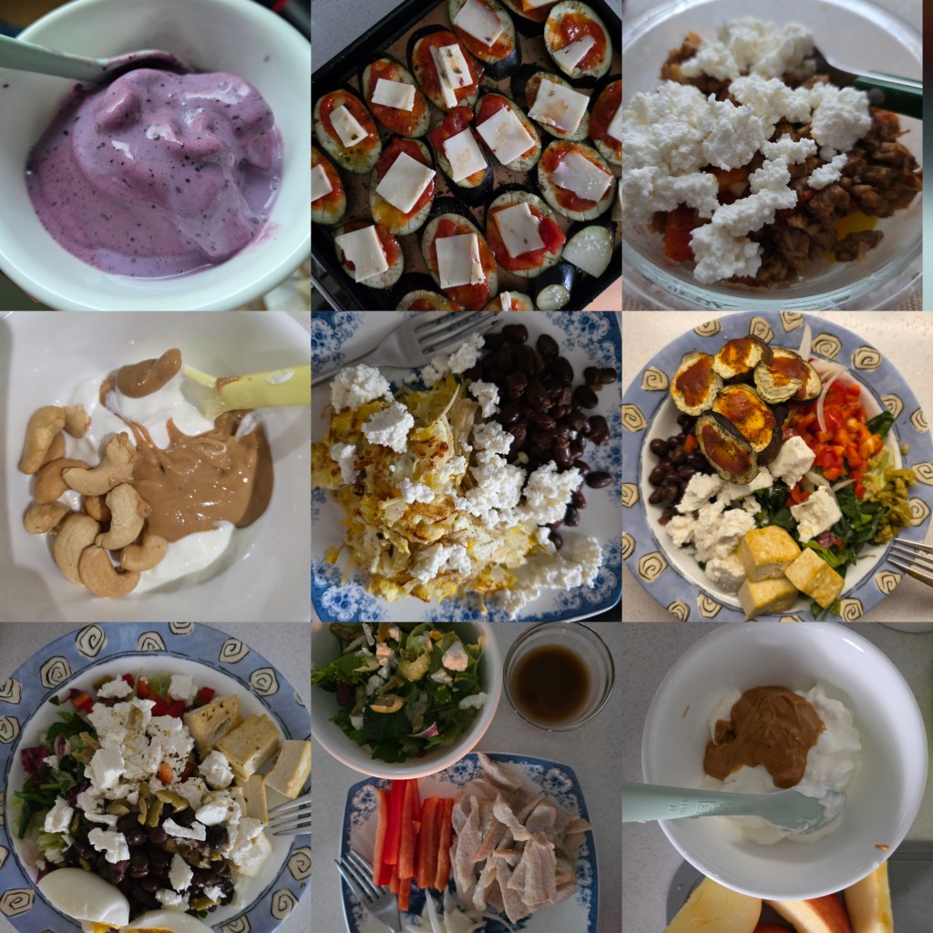 Here I experimented with turning my breakfast yogurt parfaits into a sort of acai bowl, but with frozen blueberries and banana. It was fun to make, delicious to eat, and the addition of chia seeds, cashews, peanut butter balanced out all the fruit sugar with some protein and fat. I also improvised a zucchini loaf with Korean zucchini, but did not add any sugar (would not recommend). It was only made edible with a topping of cottage cheese.