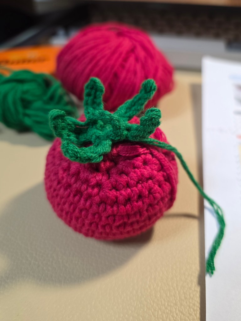 And the last crochet project of the month: a cute little stuffed tomato. (The tomato’s not tied off in this progress pic.)
