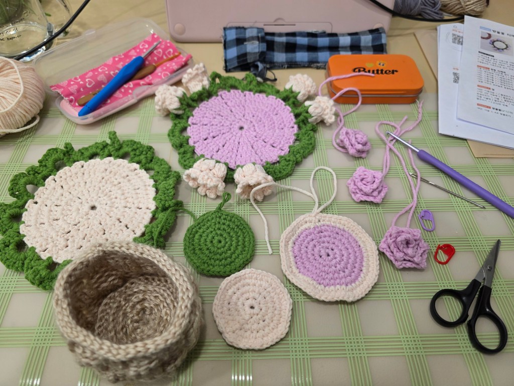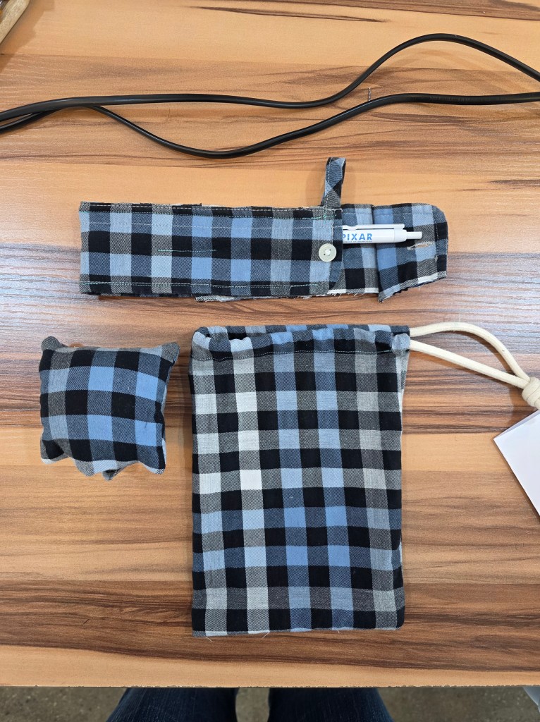 I also took a four-session sewing machine class this month. The workshop’s theme was upcyling an old collar shirt into: a pin cushion, drawstring pouch, pencil case, apron and sewing notions pouch. Here’s a pic of the cushion, pencil case, and drawstring pouch. I’ve actually been using my pencil case as a crochet hook case. The loop holds two stitch markers and my weaving needle (threaded to another string loop). It would be perfect if only I could fit in my scissors too.